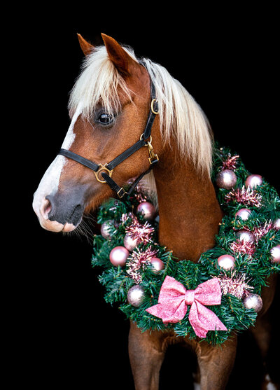 Een kerstfotoshoot vindt altijd plaats op jouw eigen stal. We zoeken een brede stal of bak ingang, waar ik vanaf buiten naar binnen kan fotograferen. Jouw paard staat in de stalingang en hoeft verder alleen maar knap te zijn met de krans om.