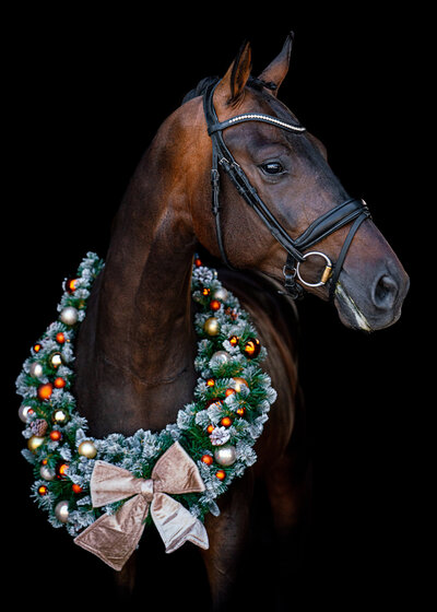 We maken samen foto's waarin de band tussen jou en je paard centraal staat, verpakt in een feestelijk jasje. Of je nu droomt van een klassiek portret (black foto of een normale foto) in kerstoutfit met een kerstkrans om of een spontane rijfoto met krans (als je paard héél braaf is), het kan allemaal.
